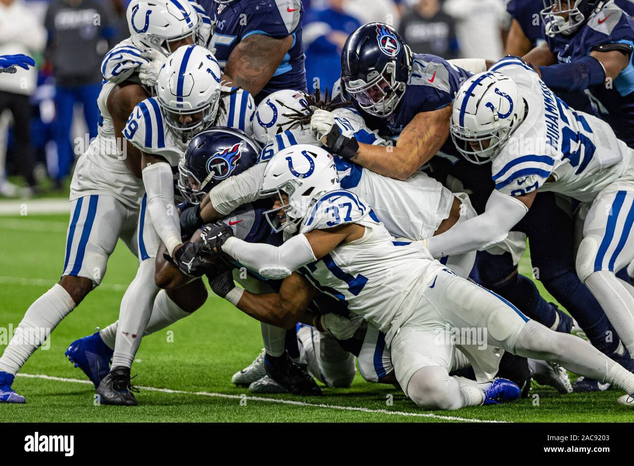 Indianapolis Indiana Usa 1st Dec 2019 Tennessee Titans Running Back Derrick Henry 22 Is Gang Tackled By Indianapolis Colts Free Safety Malik Hooker 29 And Colts Safety Khari Willis 37 In The